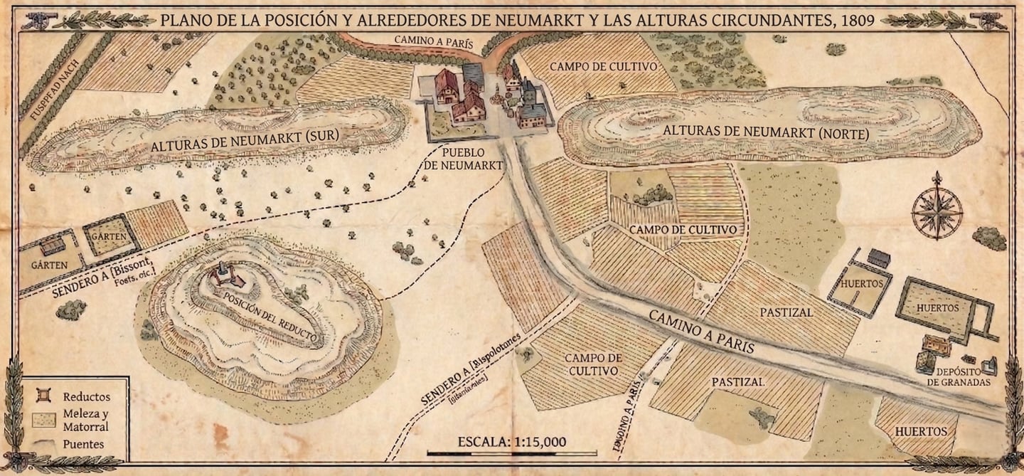 Justificación: A escala de batallón, esta área acomoda perfectamente el asalto de una división reforzada (austriacos) contra una división defensiva extendida en la cresta, dejando espacio para maniobras de flanqueo.