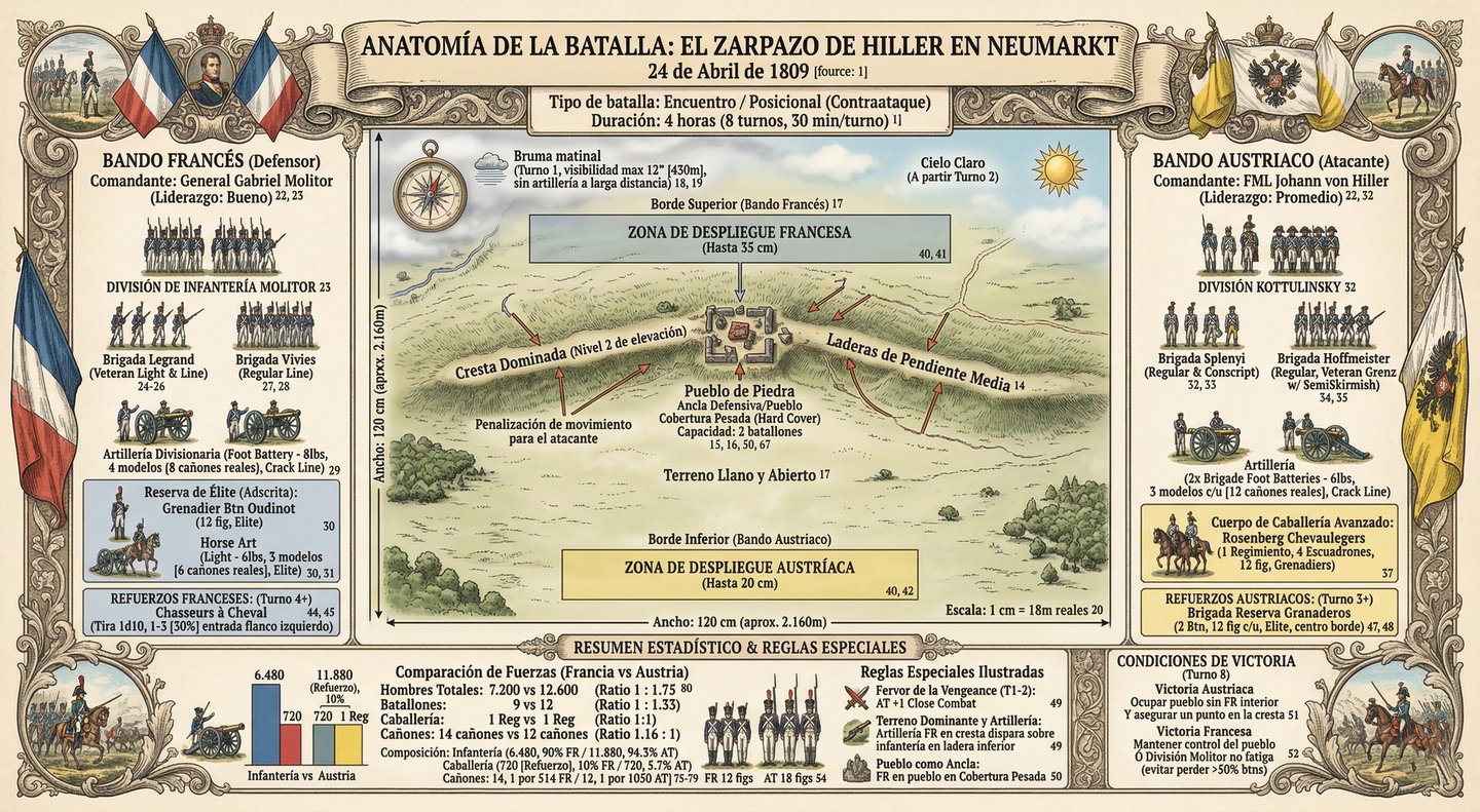 Campaña del Danubio, finales de abril de 1809. Los ejércitos franceses han fracturado la línea principal del Archiduque Carlos en Baviera. Mientras el cuerpo principal austriaco se retira hacia Bohemia, el VI Korps de Hiller retrocede hacia el este en dirección a Viena. Napoleón, creyendo que los austriacos están completamente desmoralizados, ordena a una fuerza mixta bajo el mando de Bessières que los persiga. Sin embargo, Hiller, un comandante capaz, nota que la vanguardia francesa se ha estirado demasiado. Cerca de Neumarkt, ordena a sus tropas dar media vuelta y lanza un asalto coordinado para destruir a sus perseguidores antes de que el grueso del ejército francés pueda reaccionar.