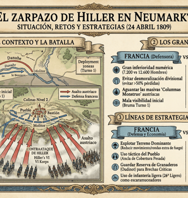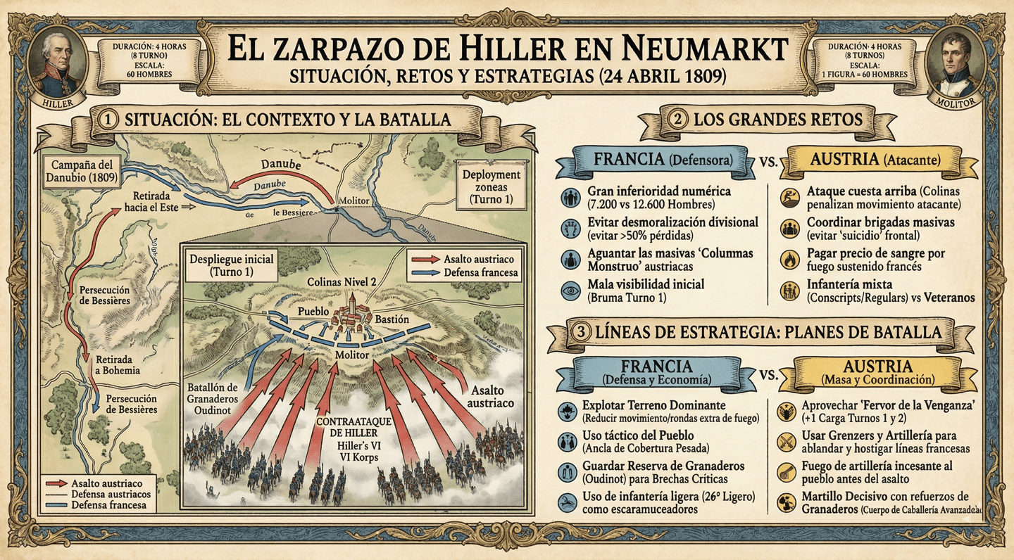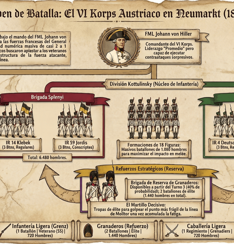 Para el jugador Austriaco (Atacante): Tienes la masa (18 figuras por batallón te dan superioridad en melée y absorben muchas bajas de fuego antes de chequear moral crítica). Sin embargo, atacar una colina frontalmente es un suicidio si no coordinas tus brigadas. Usa los Grenzers en escaramuza (SS)) para ablandar y hostigar las líneas de veteranos franceses, atrayendo su fuego. Despliega tu artillería para golpear el pueblo incesantemente y ablandarlo antes de asaltarlo. Si consigues los refuerzos de Granaderos, úsalos como el martillo decisivo sobre el punto donde la línea de Molitor parezca más frágil por la fatiga acumulada.