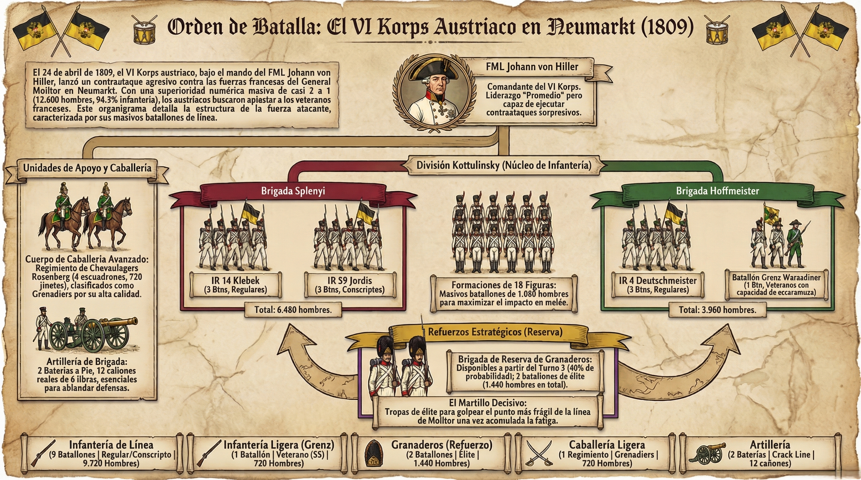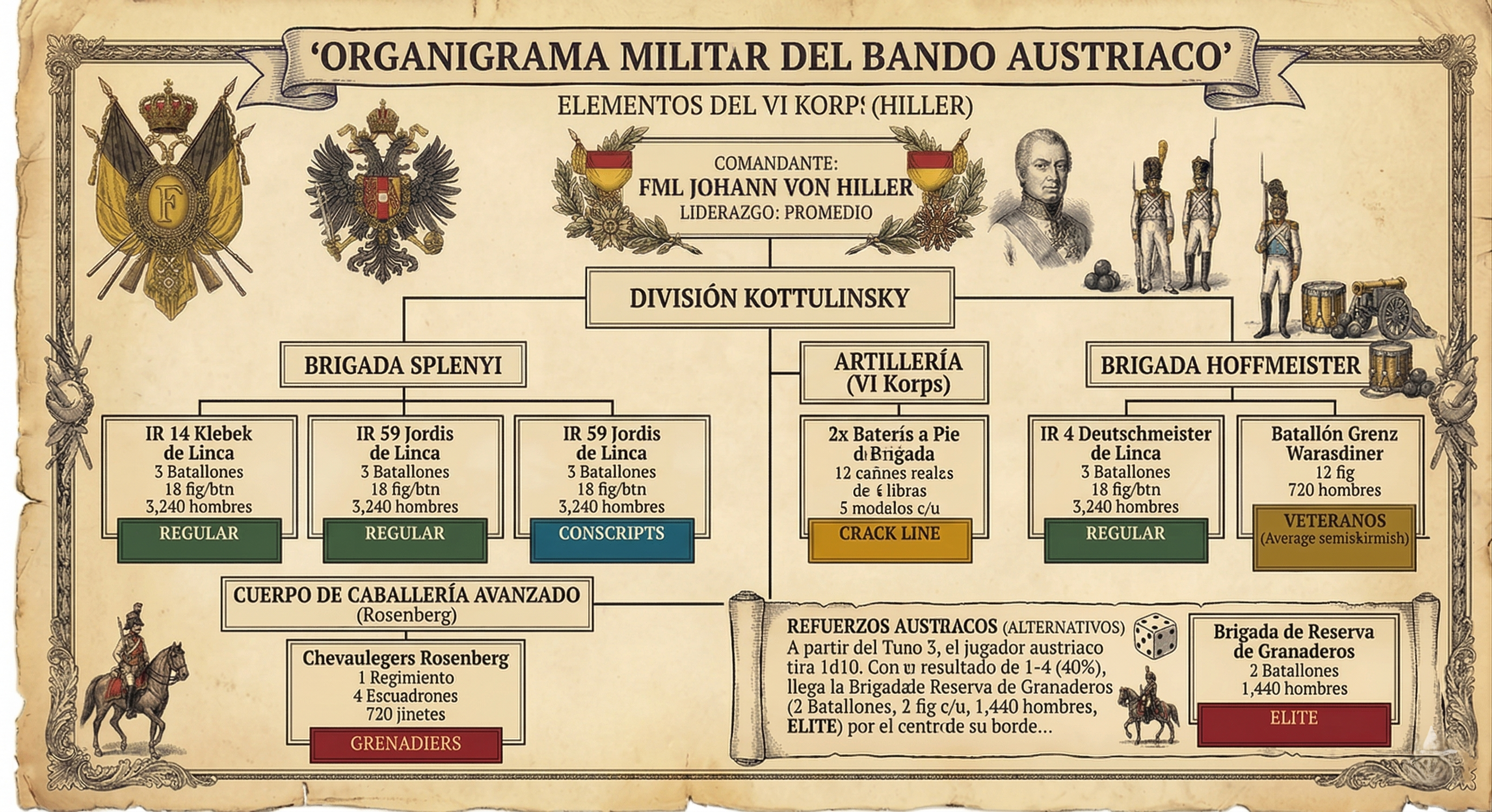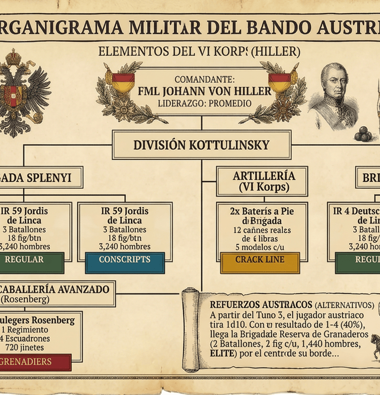 Refuerzos Austriacos (Alternativos): A partir del Turno 3, el jugador austriaco tira 1d10. Con un resultado de 1-4 (40%), llega la Brigada de Reserva de Granaderos (2 Batallones, 12 fig c/u, 1.440 hombres, ELITE) por el centro de su borde.