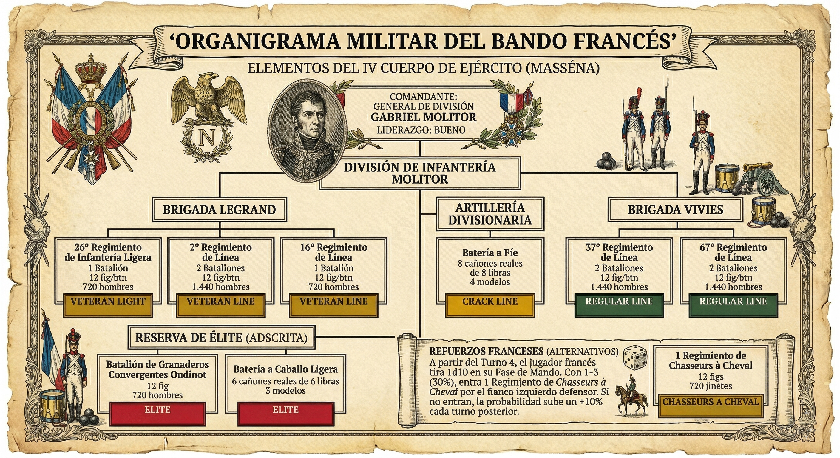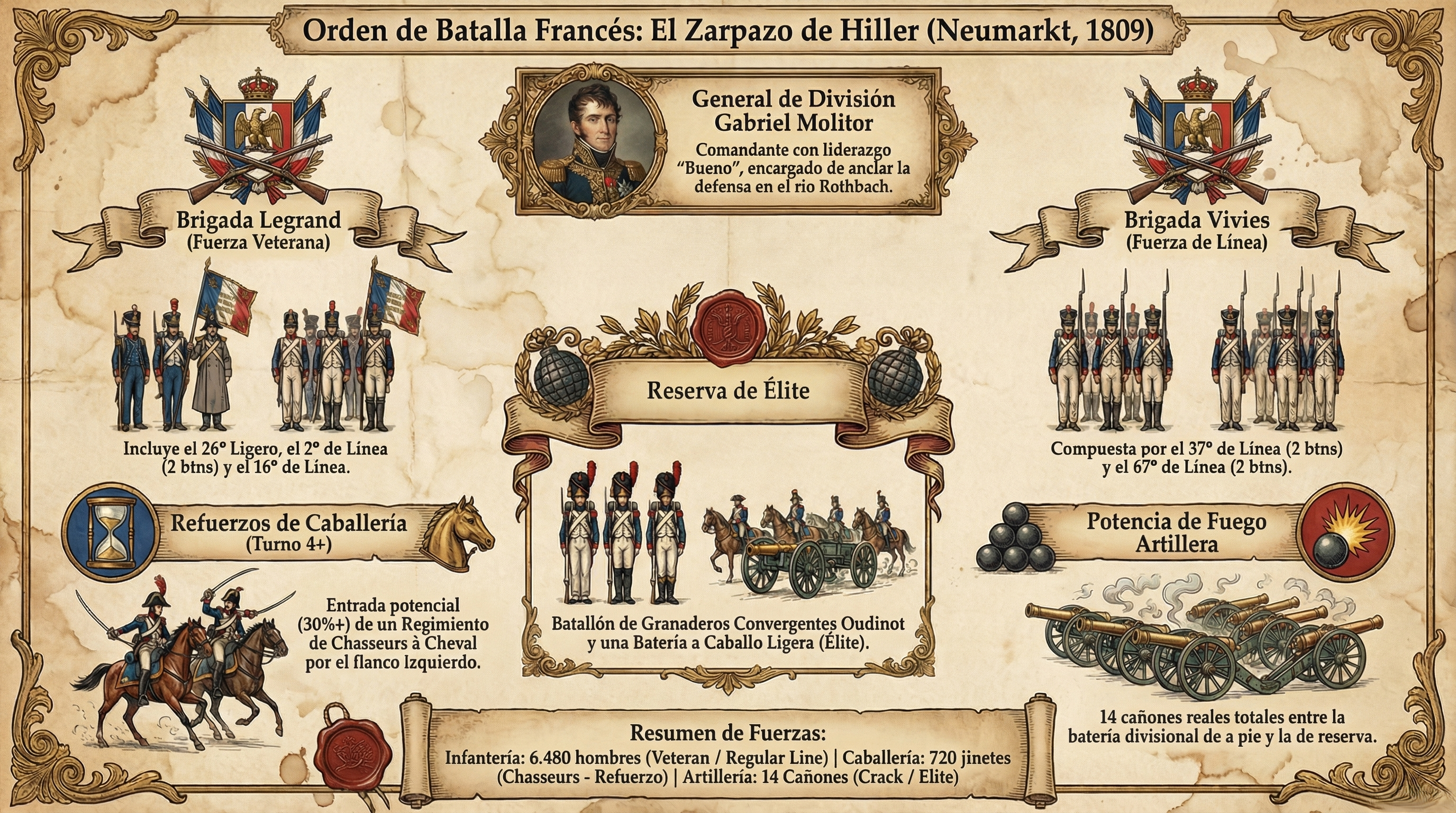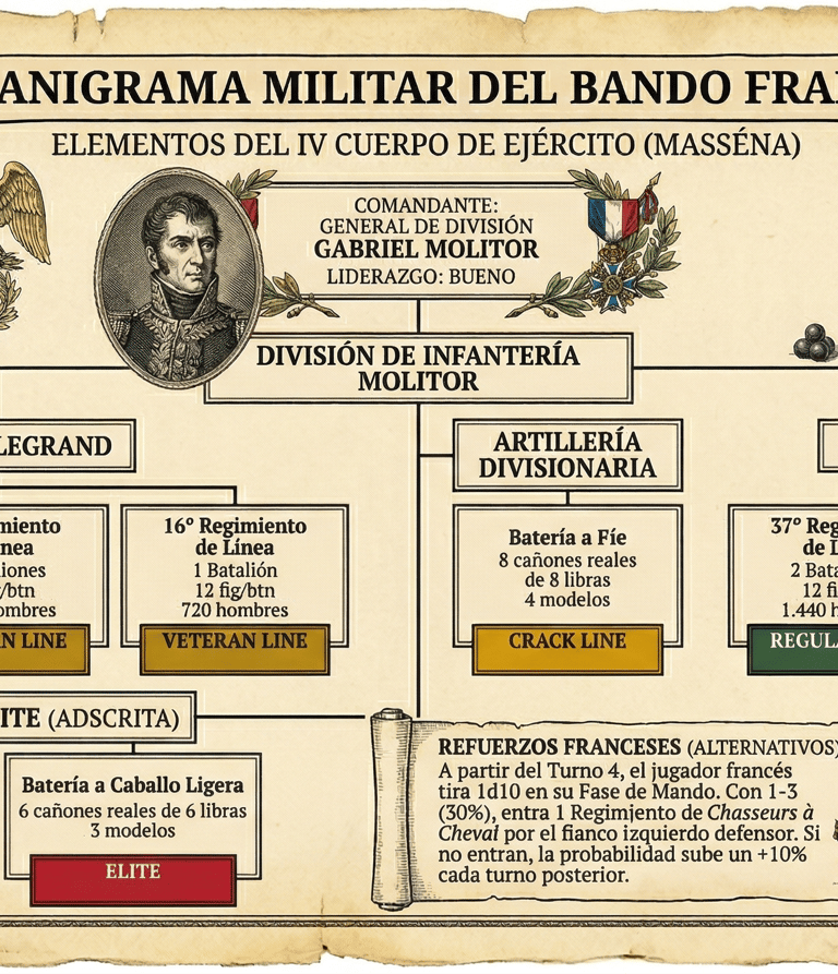 Refuerzos Franceses (Alternativos): A partir del Turno 4, el jugador francés tira 1d10 en su Fase de Mando. Con un resultado de 1-3 (30%), entra un Regimiento de Chasseurs à Cheval (12 figs, 720 jinetes, CHASSEURS A CHEVAL) por el flanco izquierdo defensor. Si no entran, la probabilidad sube un +10% cada turno posterior.