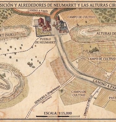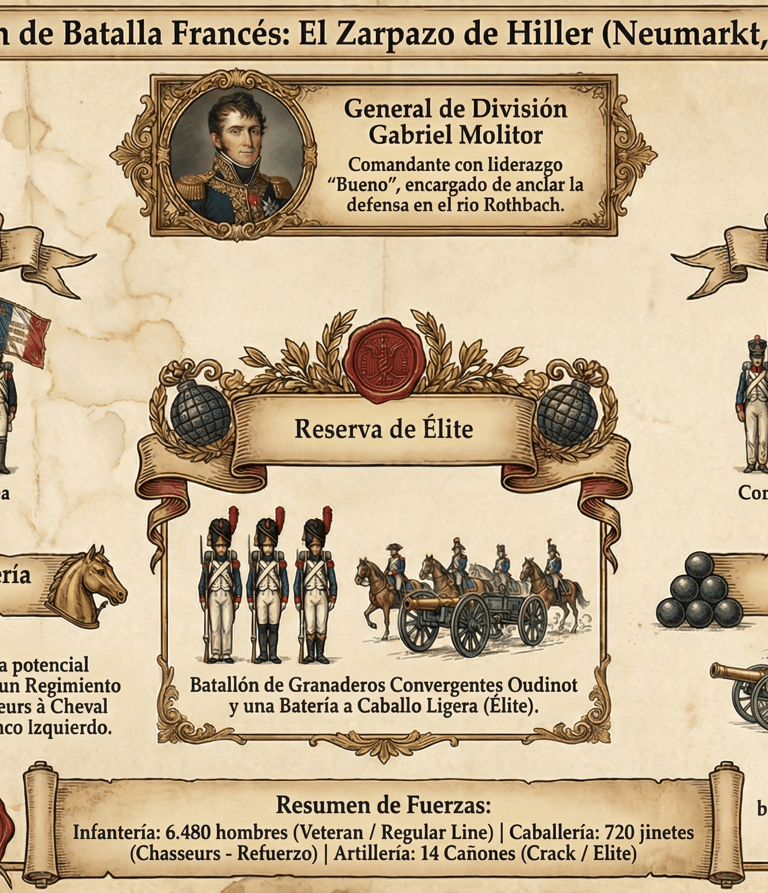 La División de Infantería del General Molitor, veteranos curtidos en múltiples campañas, ha sido el ancla de la persecución francesa. Al amanecer, los piquetes de caballería traen noticias alarmantes: los austriacos no huyen, están avanzando en formaciones de combate. Molitor, reconociendo la desventaja numérica, ha ordenado a sus hombres atrincherarse en la línea de colinas sobre el río Rothbach, utilizando el pequeño pueblo central como bastión rompeolas. Los infantes de línea franceses muerden sus cartuchos y preparan sus mosquetes. Abajo, en el valle cubierto por la bruma matinal, resuenan los tambores y las fanfarrias del Imperio de los Habsburgo. Las águilas blancas de Hiller vienen a cobrarse su venganza.