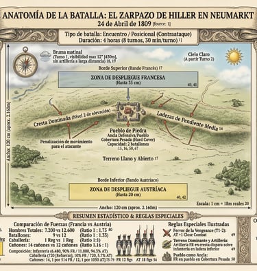 Para el jugador Francés (Defensor): Tu principal ventaja es posicional. Las colinas reducen el movimiento del atacante y lo exponen a rondas extra de fuego defensivo. La inclusión del 26º Ligero te permite desplegar una pantalla de escaramuceadores efectiva para proteger el pueblo y las laderas. El batallón de granaderos en reserva no debe comprometerse temprano; guárdalo para tapar la inevitable brecha cuando una de las masivas columnas de 18 figuras austriacas logre coronar la cresta.